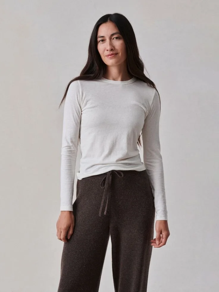 Flattering sweatshirts are a must. Your Uber Wishlist has an array of sweaters, which can also be worn at home. But sweatshirts are easy to take care of, they hold up well over time and they can introduce a more casual or approachable vibe to an outfit. This v-neck cropped minimalist choice from Aritzia is sure to be a favorite. The v-neck draws the eye to your vertical middle and the cropped length will help show off your small waist. I also adore Buck Mason for tees. They really master the perfect tee and having a long sleeve choice will make your life so much easier, as you run cold. Finish off this look with Tencel relaxed pants from Everlane. Soft, easy to care for and sustainable.