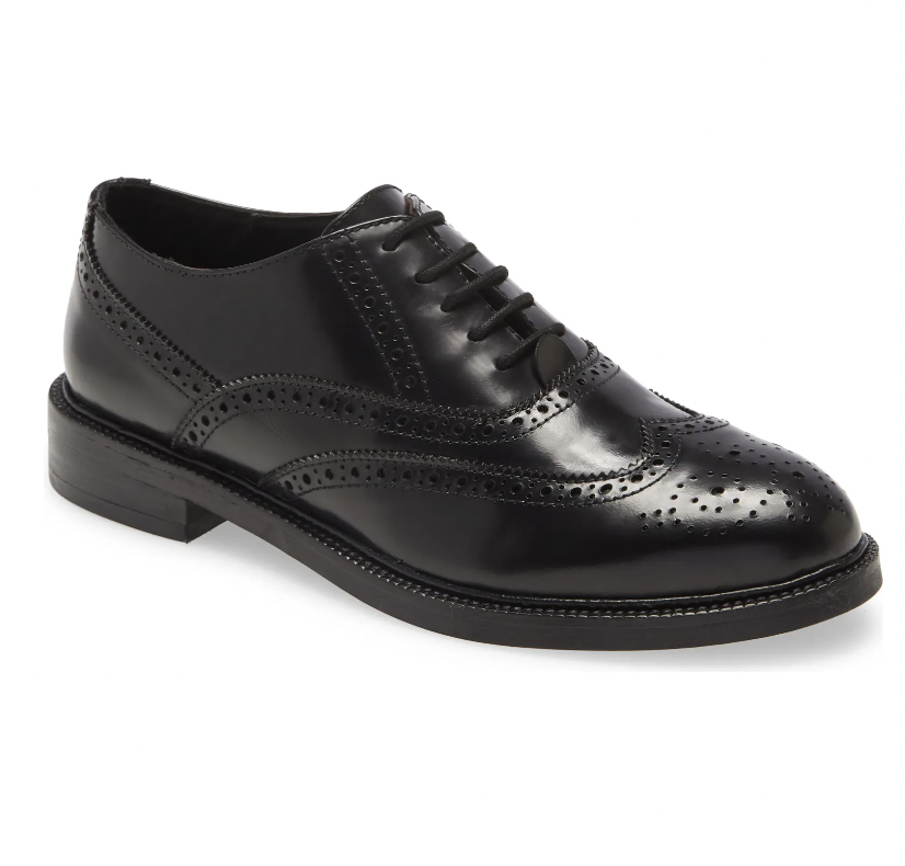 I’m really into oxfords for you. I like that you can wear them with or without tights or socks and that they have a masculine, classic vibe that will be balanced by your feminine pieces. Additionally, they are timeless and super comfortable. I vote for either black or brown. Just know either will get lots of action. Try them with dresses or pants.