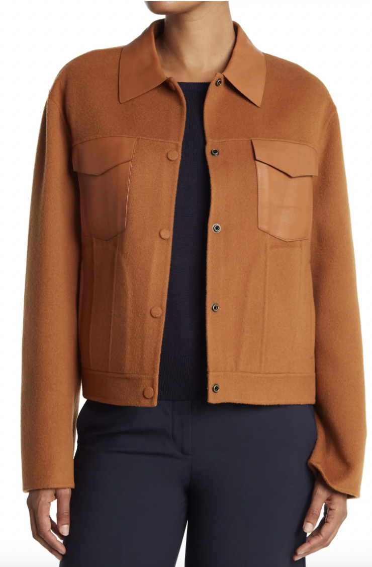 Wilfred Free The Ganna Long Shirt Jacket. Available in several colors, prints. Aritzia. $248. XL. Content: 100% merino wool; Trim: 100% cotton. Pre order for January 2022.