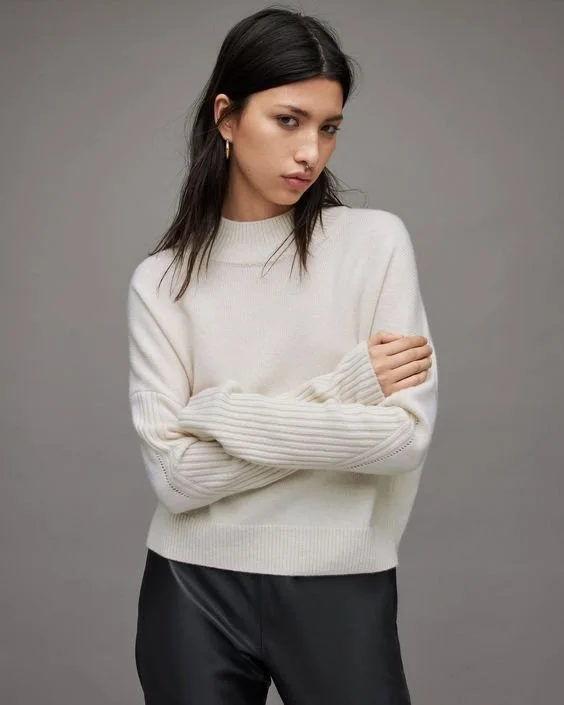 Margot Roll Neck Ribbed Sweater. Available in three colors. All Saints. Was: $199. Now: $99. 45% wool 36% polyamide 15% alpaca 4% elastane. RWS certified wool (CU 870616). The Responsible Wool Standard (RWS) is an industry tool that ensures the wool comes from farms where the land has been managed and the sheep have been treated responsibly - find out more