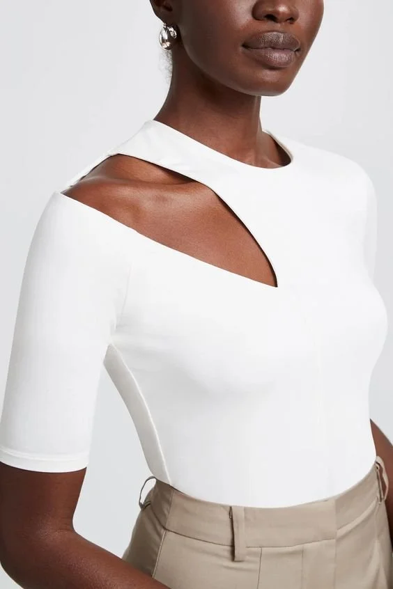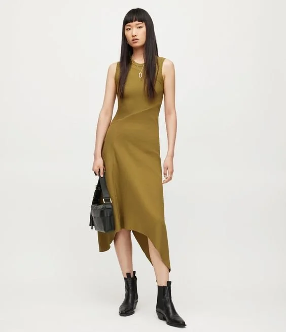 This cut is everything. It minimizes your stomach, shows off your shape and is a crazy comfortable and functional piece. It will likely be too long, so we can also change the hemline to the shape that speaks to us. I really like the idea of the necklace above with this dress.