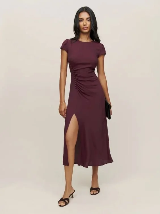A workhorse, this dress is flattering and just right for more conservative occasions. We’ll likely need to alter the length, so we can address the slit at the same time. To make this feel edgier, add the teal leather jacket and boots.