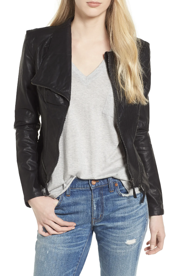 BLANKNYC Faux Leather Moto Jacket. Available in multiple colors. Nordstrom Rack. Was: $98. Now: $44. 60% PU, 40% polyester