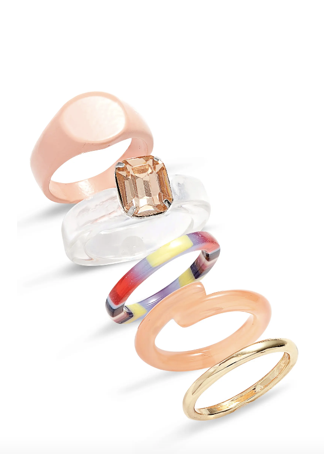 Why not mix things up with rings? And since we are experimenting, why not do that with an insanely affordable choice? Stacking rings is super cool for you and this color palette is easy to work with.