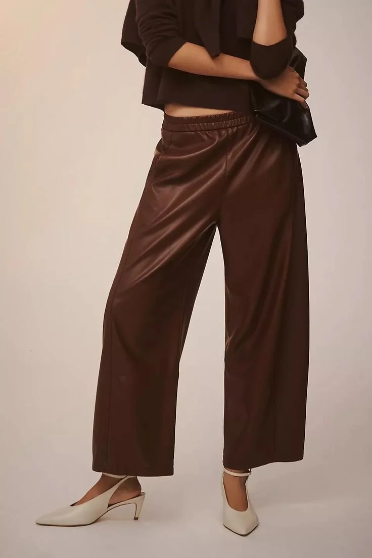 More sweatshirts, please! Both of these serve a different purpose and each will get lots of action in your wardrobe. Marcella’s off the shoulder choice is feminine, comfortable and a lightweight choice that’s great as the weather warms up. Try it with a strapless bra for the full effect or layer it over a tank top with a traditional bra for nights at home or if you prefer something a little more conservative. Cropped sweatshirts are a major win for you as they highlight your small waist and still keep you looking and feeling nice and casual. I especially like this color for you. And of course, this outfit all comes together thanks to the vegan leather barrel pants. Yes, they are a current, of the moment choice. But, I expect them to be useful for a couple of years or so. Vegan leather is a dream in the rain and this style is super comfortable and roomy. You’ll have an elevated casual look that’s just right for super relaxed situations. Also- holy Black Friday Sale Anthropologie!