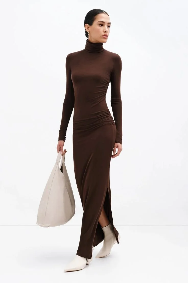 Baxter Turtleneck Dress. Marcella NYC. Was: $115. Now: $97. Sustainable European Jersey (96% Tencel, 4% Elastane). Machine wash on delicate cycle, or hand wash in cold water. Tumble dry on low heat, or for best results, lay flat to dry. Designed in NYC. Handcrafted in Europe. Our production team enjoys a living wage, a 40-hour work week with paid overtime, free health insurance and 20 days annual paid vacation.