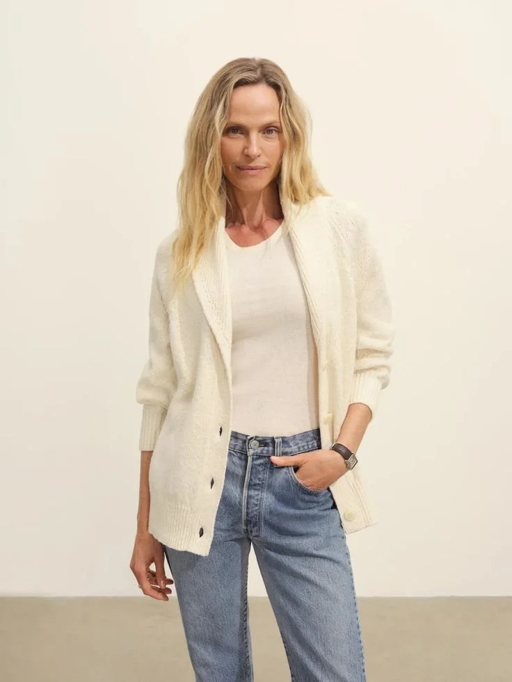 The rest of this outfit is focused on comfort and functionality and elevated with color. Because we are opting for winter white/ ivory/ cream, everything feels much more luxurious and polished. But you are wearing super cozy clothes! We’re leaning into sweatshirts for you. They make a lot of sense for your lifestyle and with proper pairing, they can still feel elevated. This option from Marcella is great quality, really flattering and not a ubiquitous design, setting you apart from the pack. The vest makes every outfit more sophisticated. Toss it on over the most casual pieces and quickly see results. Working from home means that you want to be comfortable there and effortlessly toss on an item or two to transform your look. Typically, that means adding a polished coat (or vest!), a great pair of shoes and finishing things off with the right bag. So, imagine yourself in the most relaxed version of each outfit at home, then popping on the finishing touches to head out or take a video call. This look finishes off with a flattering pair of dark brown coated jeans. Again, polished and still just right for Friday night out with your family friends and the kids.